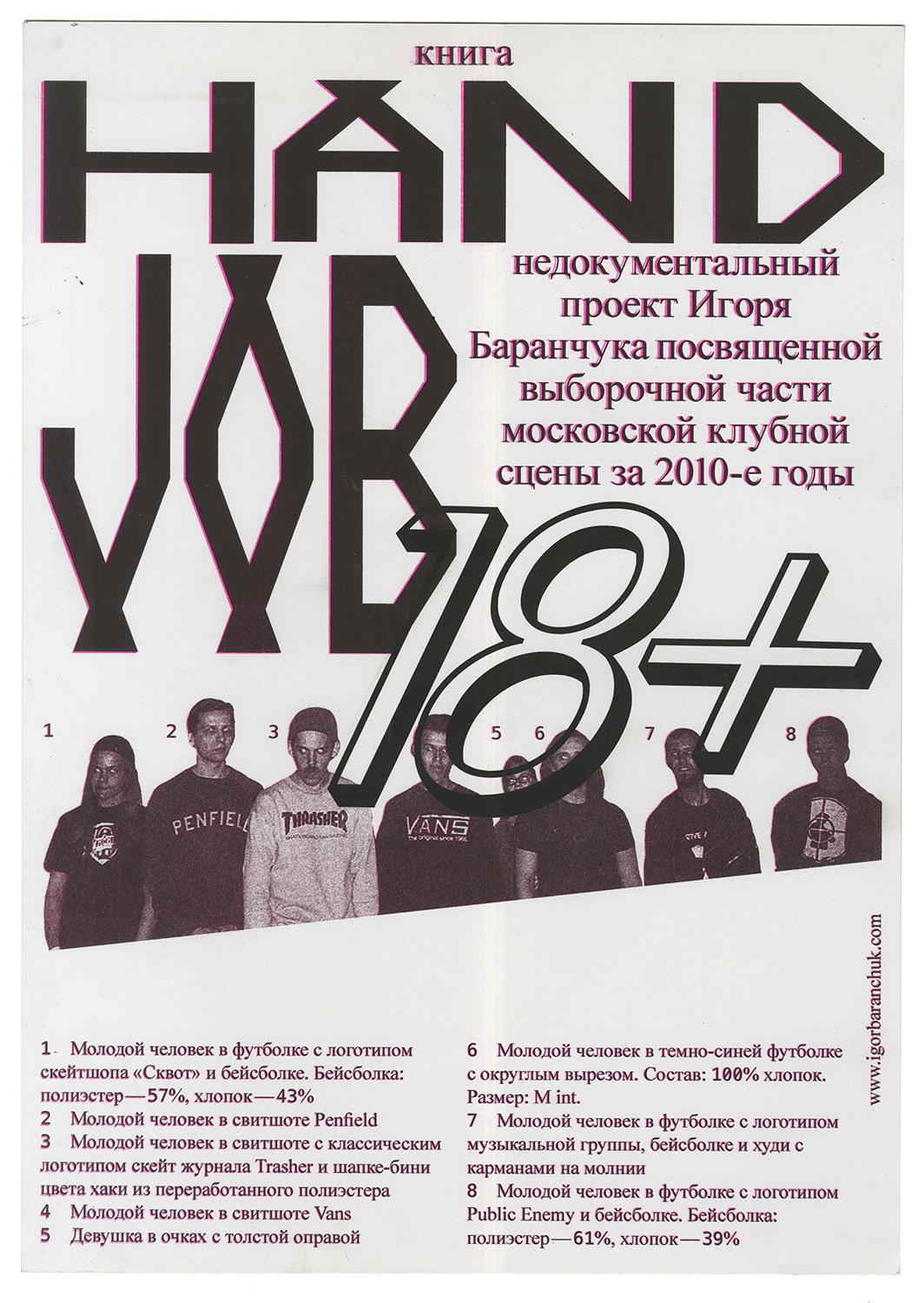 Книга Handjob. A Non-Documentary Project by Igor Baranchuk — совместный проект с фотографом Игорем Баранчуком — интерпретация авторского архива Игоря, посвященного московской клубной сцене 2010-х. С точки зрения проектной работы, архив — это всегда интересная проблема. Архив претендует на документальность и сопротивляется сжатию по определению. Очевидно, что чем больше архив, тем лучше. Дополнительная особенность конкретного архива в том, что провокационные сюжеты теряют остроту рядом друг с другом и потеря пропорциональна количеству фотографий. Показать объем архива и преодолеть это сглаживание было одной из целей нашей книги.