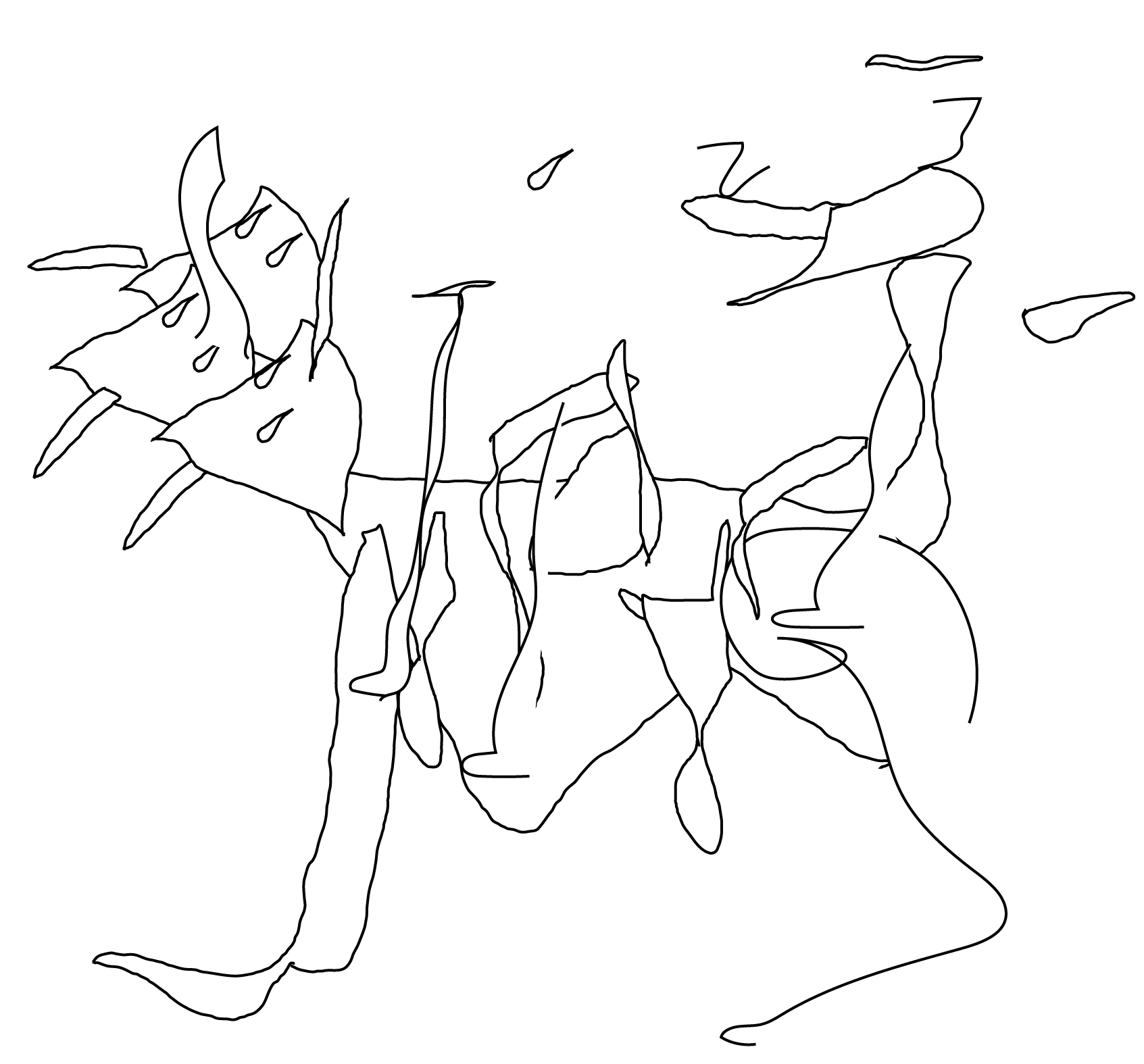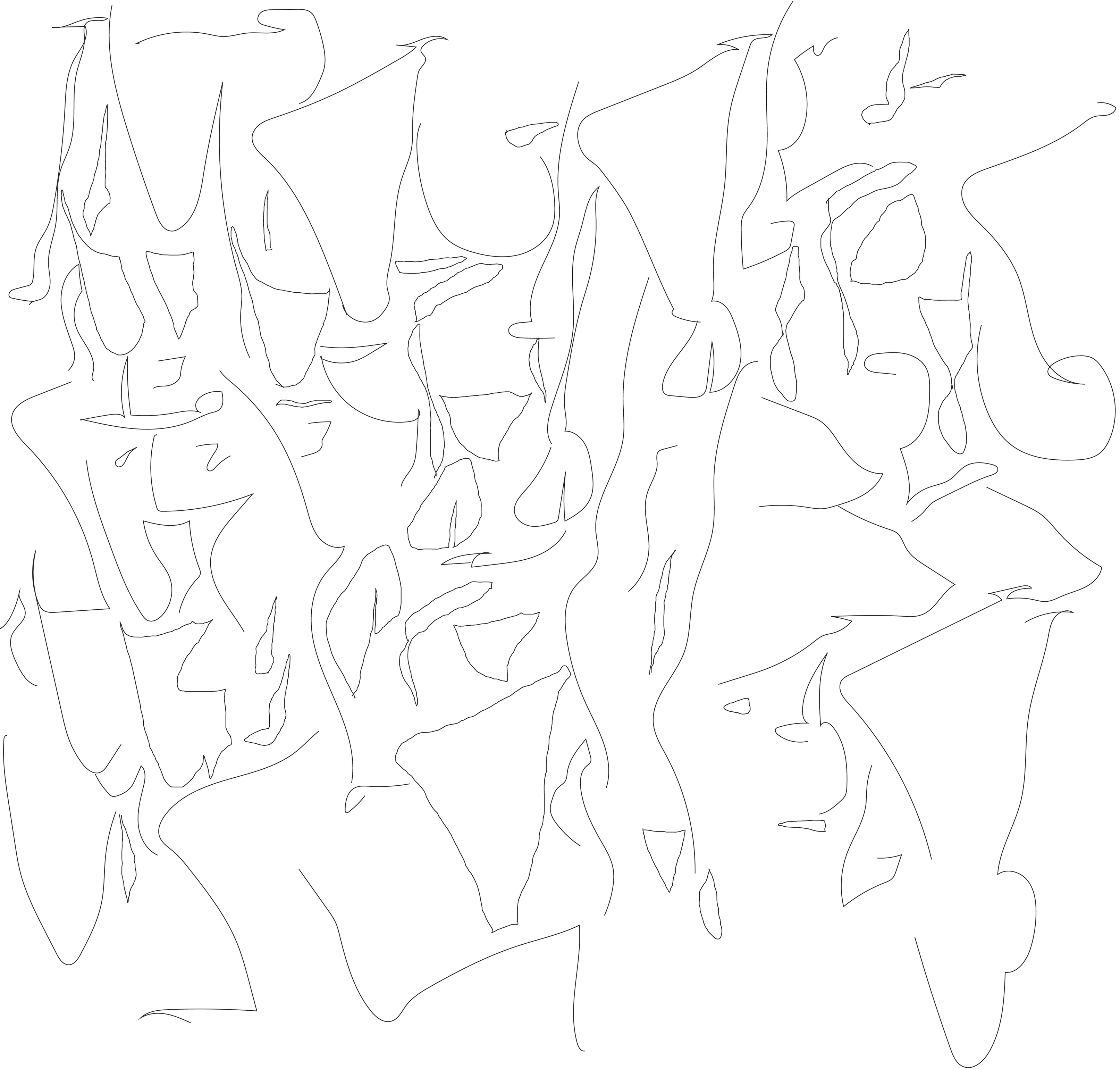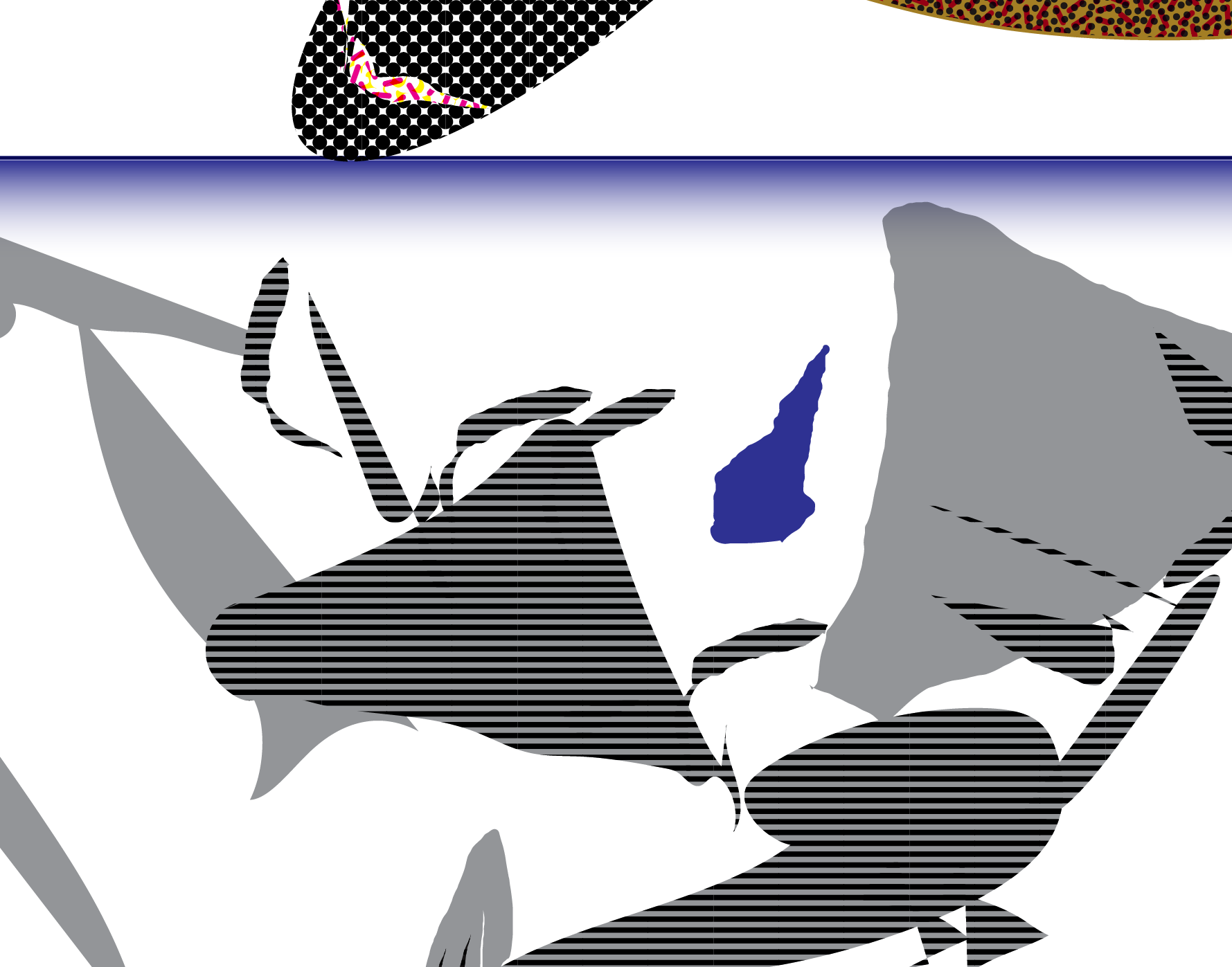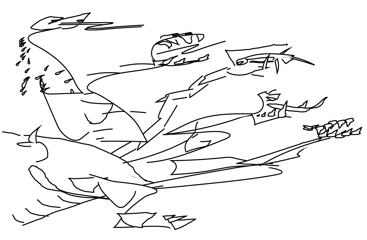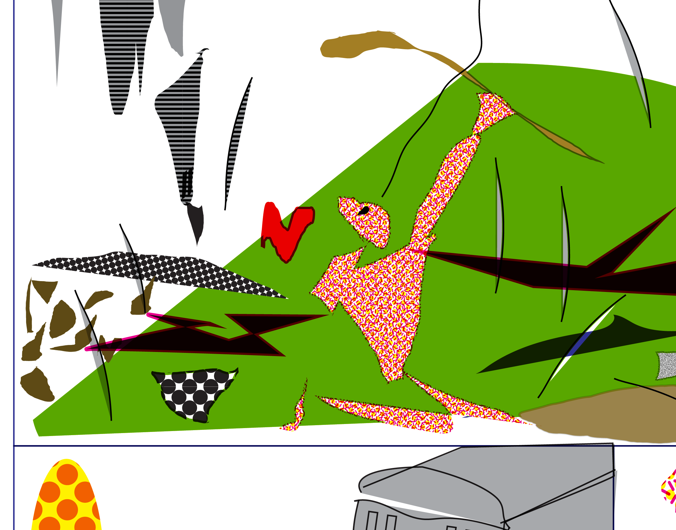 На первых этапах я пробовал работать с живым муравьем, которого выпускал на лист бумаги и вёл за ним линию карандашом, но муравей всегда хотел как можно быстрее сбежать, то есть двигался по прямой, что не было особо похоже на генератор случайной графики, пусть направление и менялось. В итоге, для этого принта я визуализировал траекторию полета птицы на случайном видео и использовал полученные линии и формы, для того чтобы собрать небольшой комикс о двенадцати подвигах Геракла. Геракл показался мне подходящим символом субъектности и свободного действия. Графика была вручную растеризована для печати на ризографе в семь красок на формате А3 в мастерской ризографии de Stencilzolder.