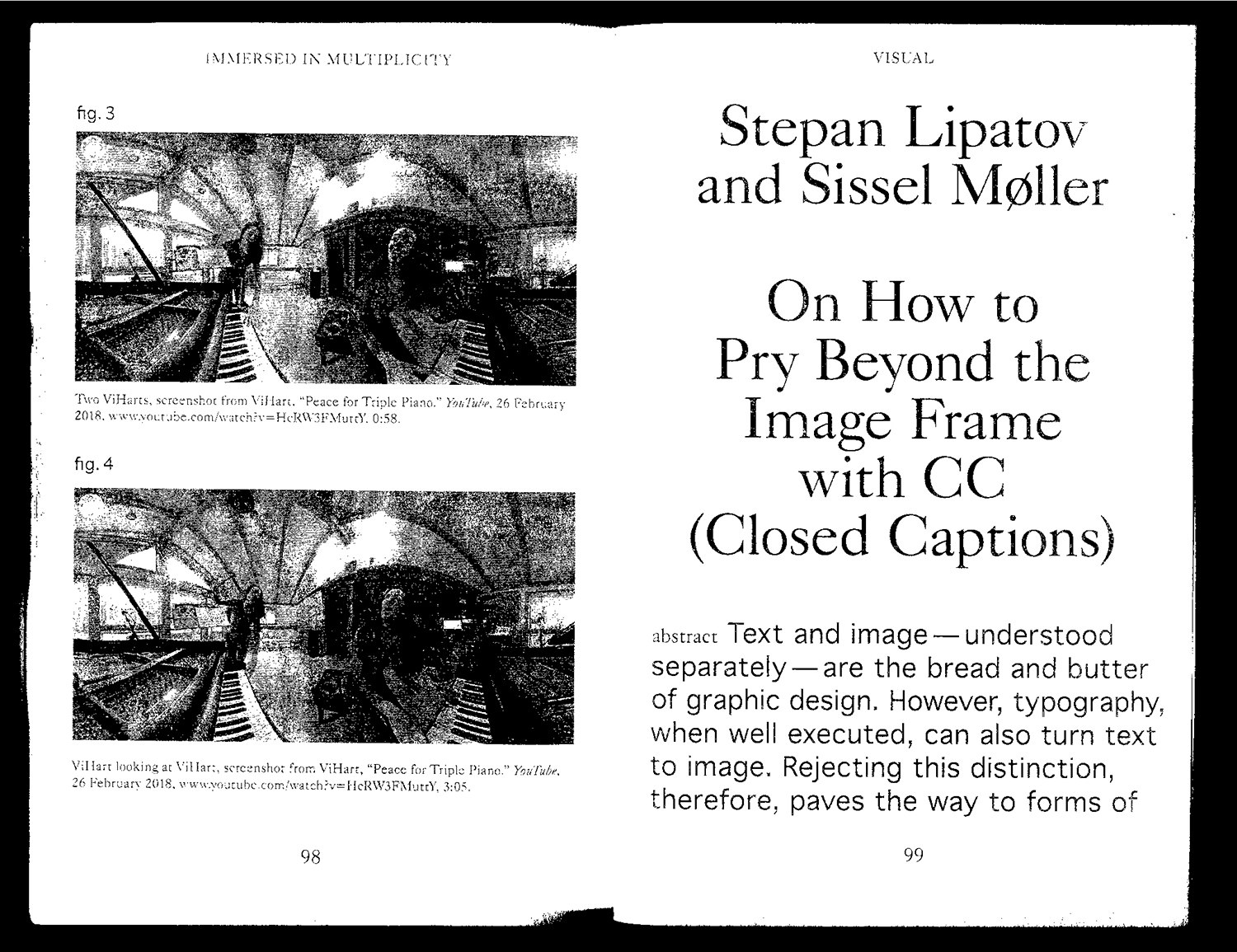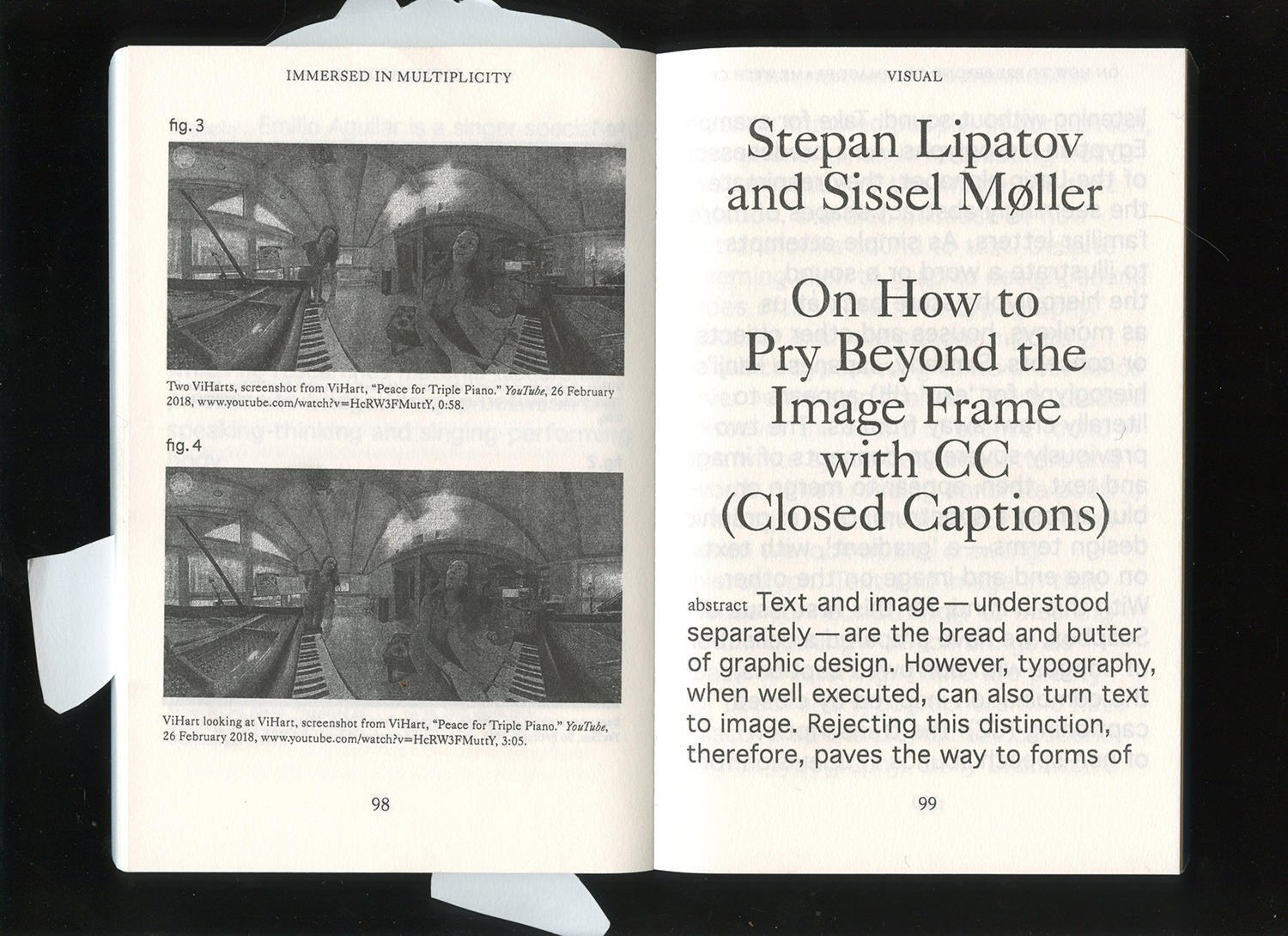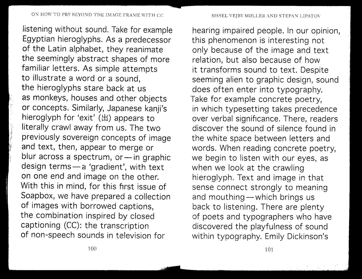 Для нас с Сиссел было интересным не только сделать макет печатного издания, но и участвовать как авторам. Вместе с дизайн-концепцией издания мы предложили редакции, что в каждом номере будем разрабатывать собственную более визуальную главу. Первый номер журнала был посвящен аудиальным практикам. Для него мы подготовили главу, которую назвали «Как подглядеть за край картинки с помощью *закрытых подписей* (closed captions)». Посмотреть на результат и прочитать комментарий к главе можно ниже. Кроме самого журнала, к каждому выпуску, мы делали картинки для соцсетей, плакаты итд.