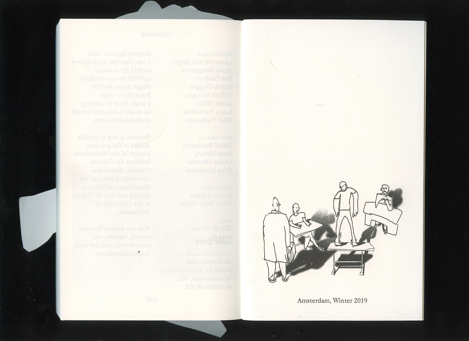 Soapbox — это платформа для публикации текстов молодых ученых, созданная факультетом Культурного анализа Амстердамского университета. Проект существует в печатном виде и как интернет-издание. Каждый номер журнала посвящен одной теме. Дизайн и концепцию печатного издания 2018-2021 годов я разработал совместно с Sissel Vejby Møller. Мы получили этот проект как applied assignment в Академии Ритвельда (когда студенты старших курсов работают над реальными проектами) и продолжили работать над журналом в течении двух лет после выпуска.