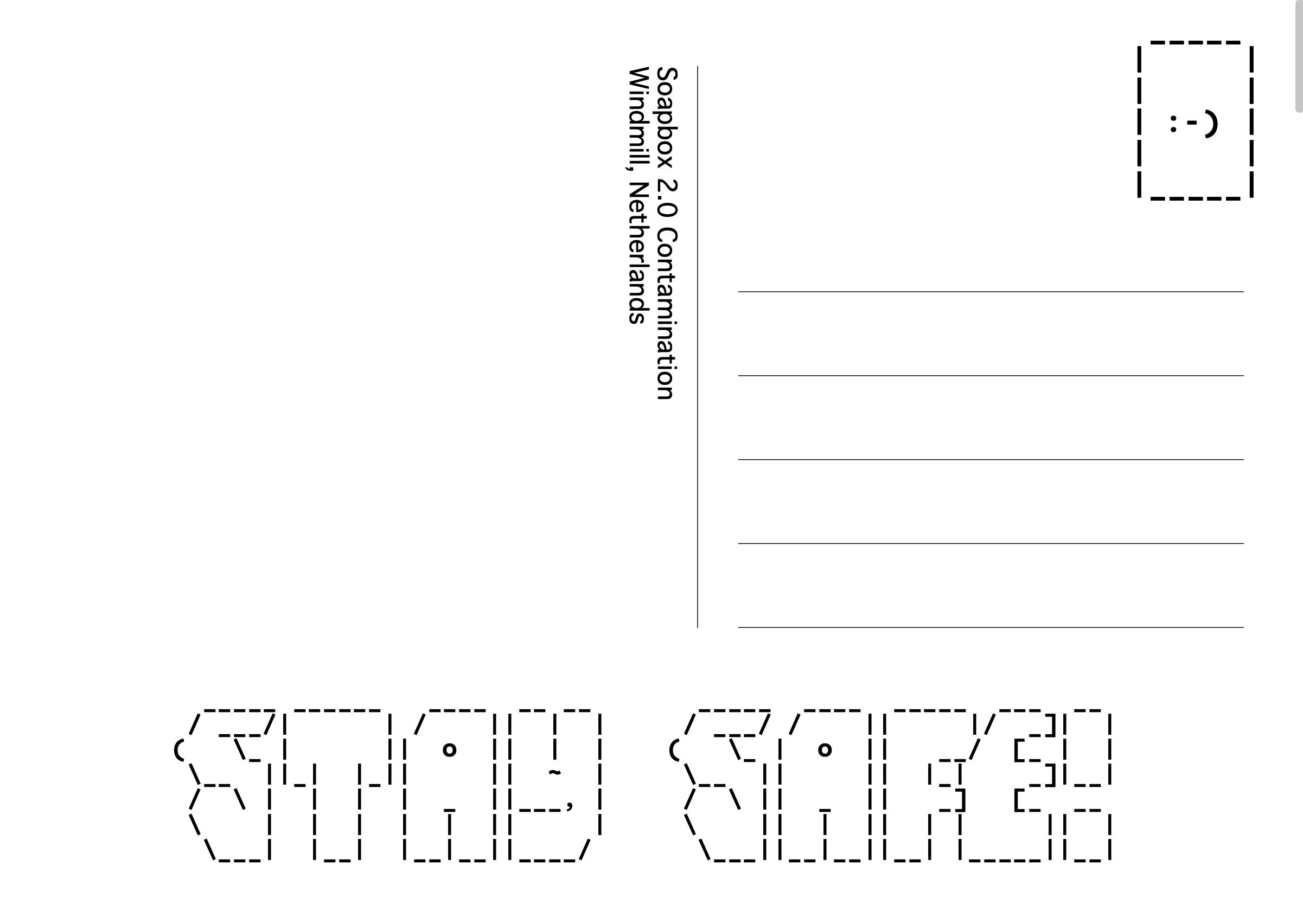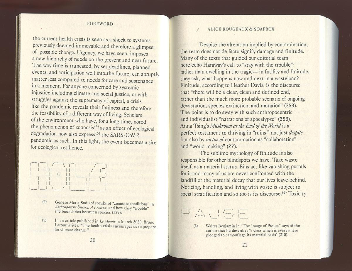 Каждый номер журнала Soapbox посвящен одной теме, третий номер был о заражении / загрязнении (contamination). Кстати, эта тема номера никак не связана с ковидом, она была выбрана за месяцы до пандемии. Чем пандемия повлияла на журнал, не считая задержки, так это словами ‘hope you are well’ на обложке и вариациями этой подписи из переписки на открытках, которые идут вместе с этим номером. Мы с Сиссел решили перенести эти странные / экстремальные и, в какой-то момент, резко опостылевшие подписи из переписки о книге в макет.
